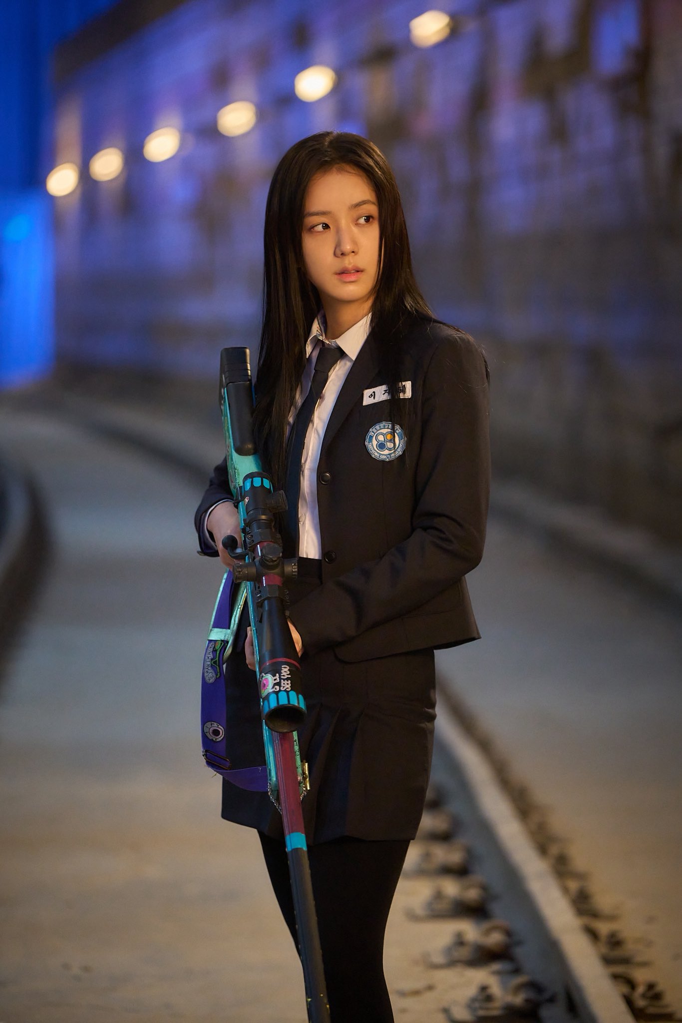 Jangan sampai terlewat, Jisoo BLACKPINK yang berperan sebagai Lee Ji Hye tampil menarik menggunakan pakaian seragam sekolah sambil menggenggam senapan.