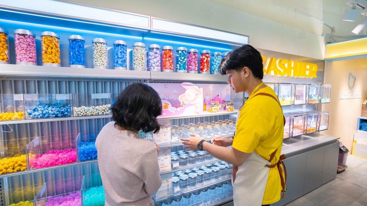 Pengunjung di tempat ini dapat memilih wadah kaca yang tersedia dalam beragam ukuran, seperti kecil, sedang, maupun besar, lalu mengisi sesuai dengan mainan mini favorit mereka sendiri.